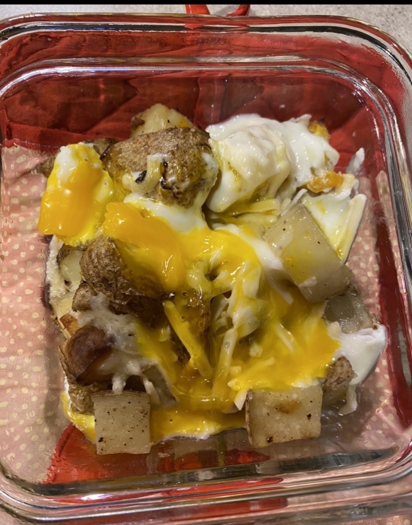 7. Poke egg so the yolk runs over the potatoes, cheese, and bacon bits. Careful, it’ll likely be hot so be sure to blow on it and then enjoy!
